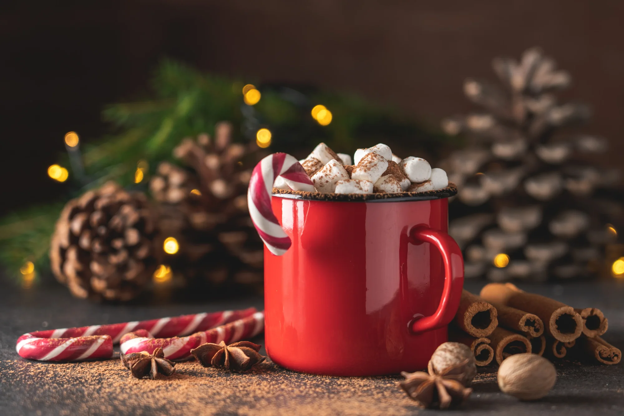 Christmas and new year food background including a cup of hot chocolate with marshmallows, candy canes, cinnamon rolls